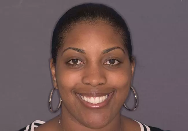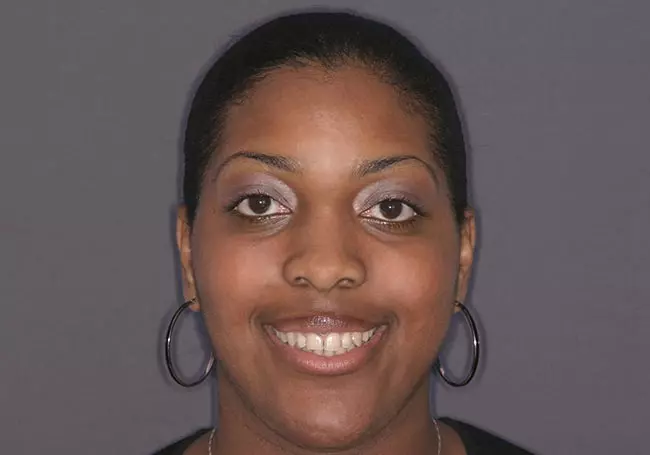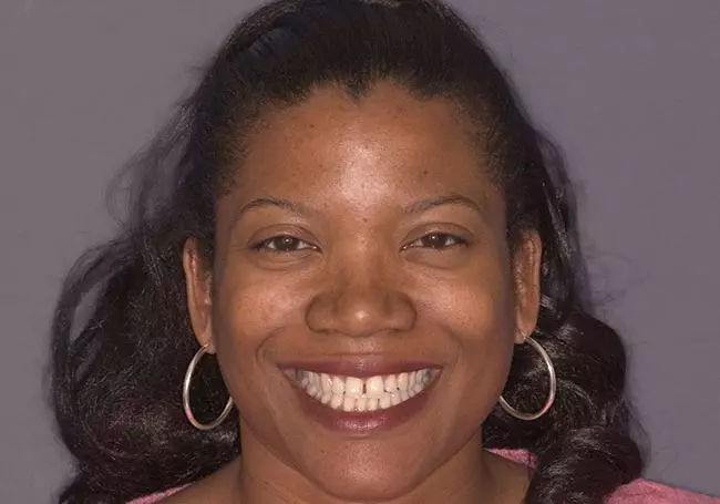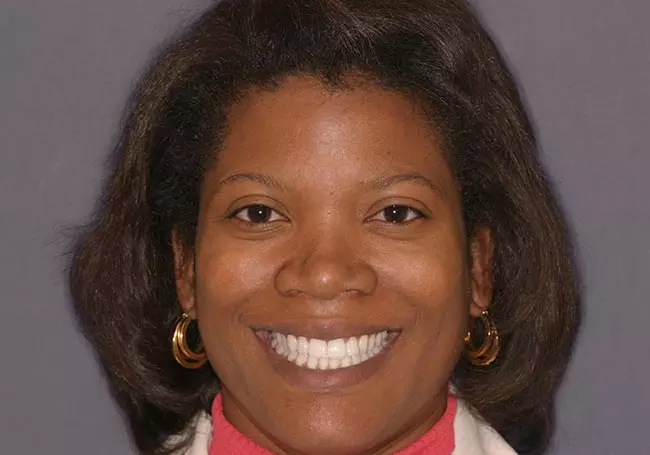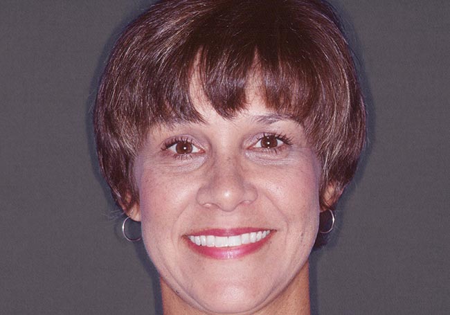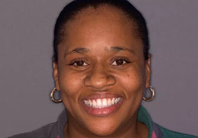 Her teeth were stained from tetracycline, an antibiotic prescribed to her during child-hood while her teeth were developing. A Smile Design and eight Porcelain Crowns whitened her teeth, enhanced her smile, and helped change her overall image.