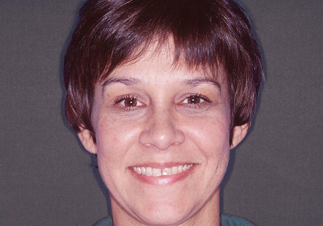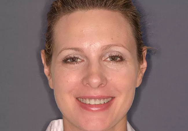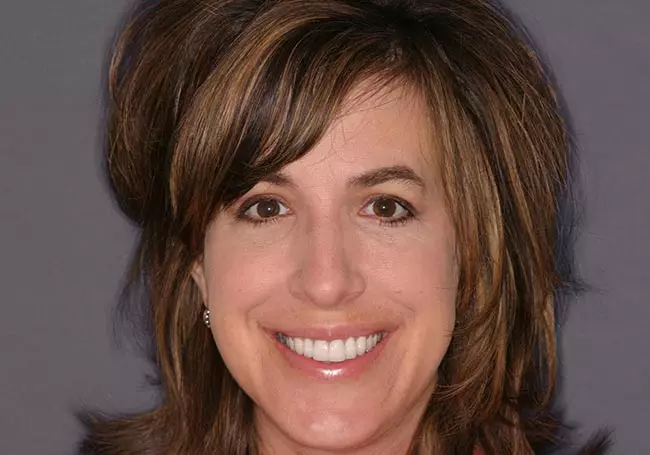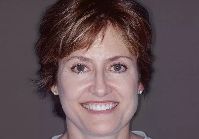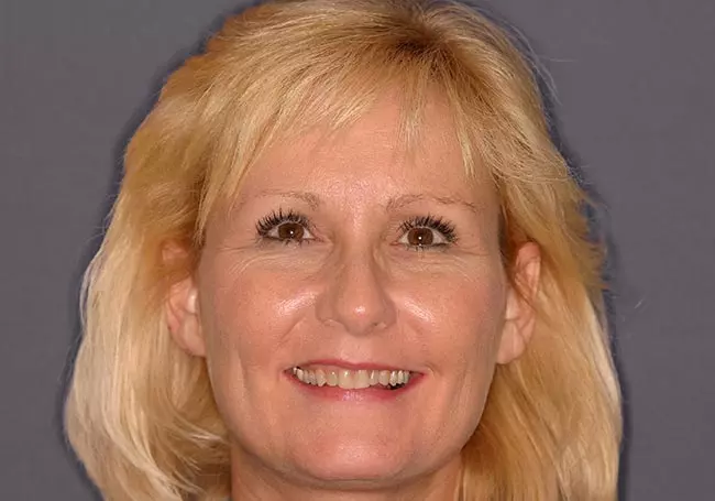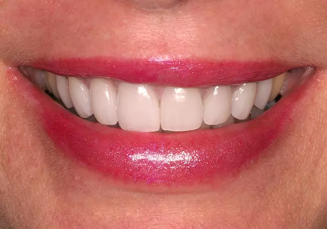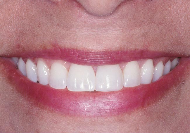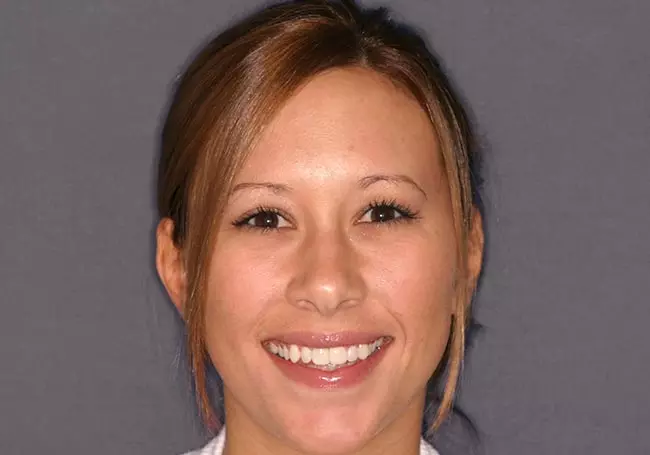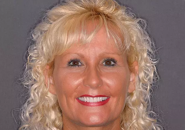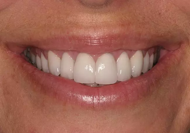 Her two front teeth which had a history of trauma were previously restored with root canals, posts, and crowns. Now, years later, both teeth were undergoing root resorption and could no longer be saved. Along with Zoom Whitening, the roots and old porcelain fused to metal crowns were removed and replaced with two Dental Implants, two Tooth-Colored Zirconia Abutments, and two Porcelain Crowns.