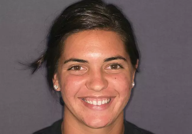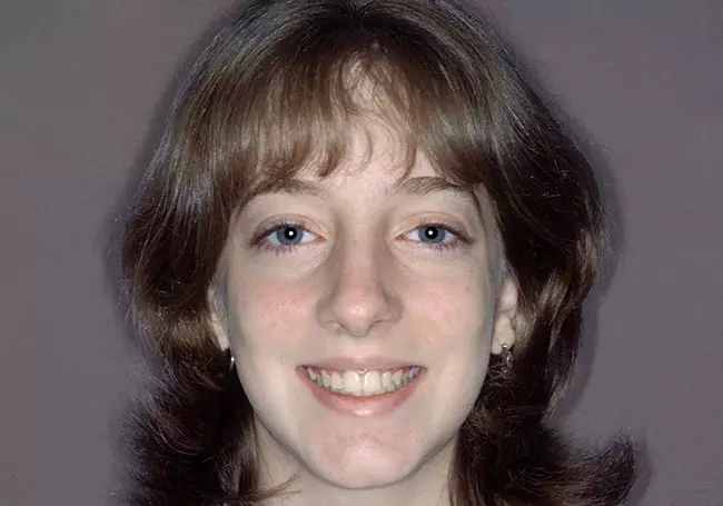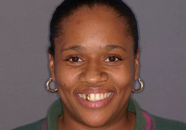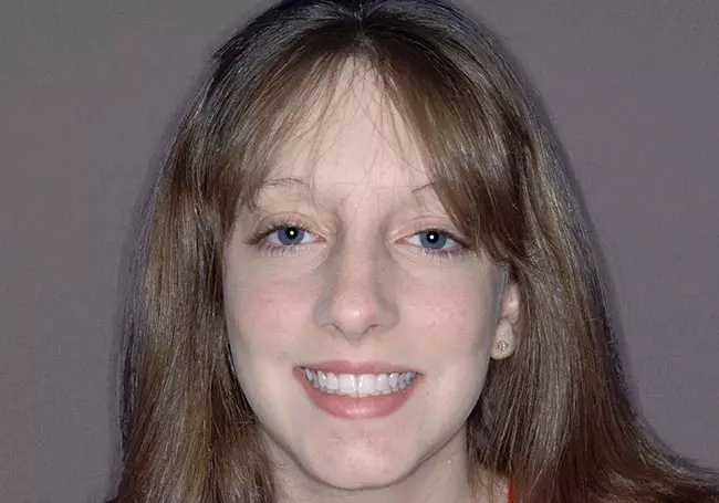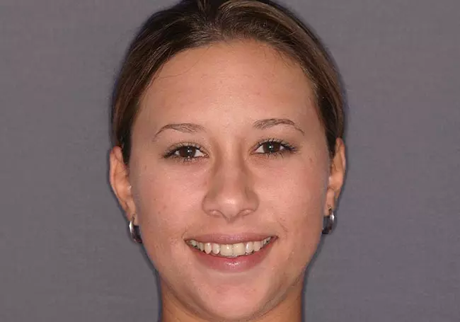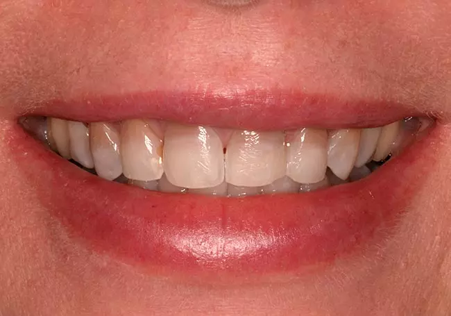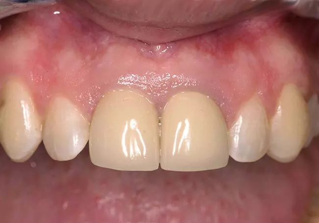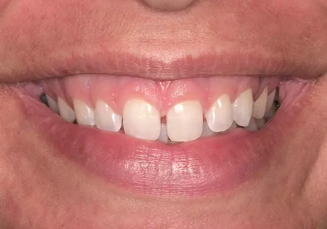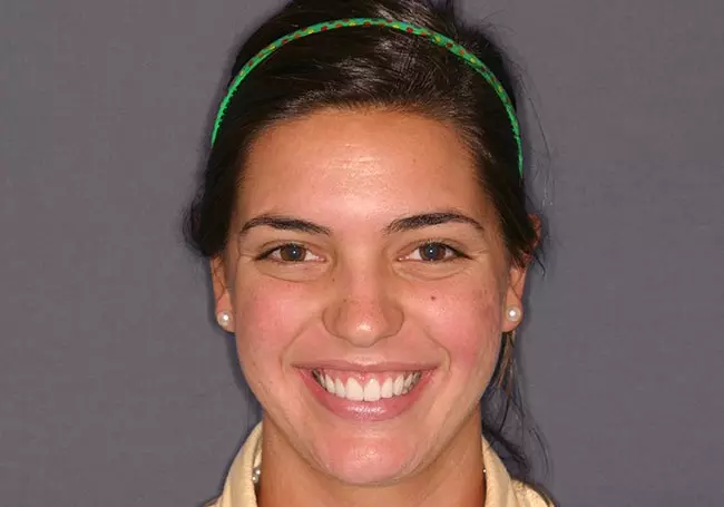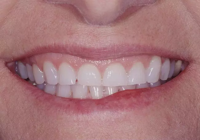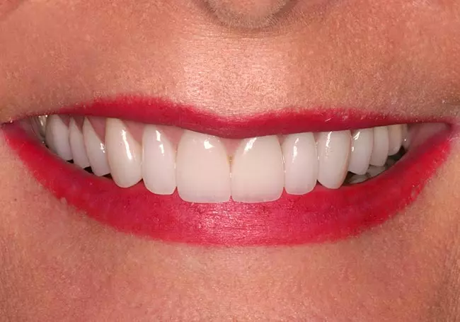 Her two front teeth which had a history of trauma were previously restored with root canals, posts, and crowns. Now, years later, both teeth were undergoing root resorption and could no longer be saved. Along with Zoom Whitening, the roots and old porcelain fused to metal crowns were removed and replaced with two Dental Implants, two Tooth-Colored Zirconia Abutments, and two Porcelain Crowns.