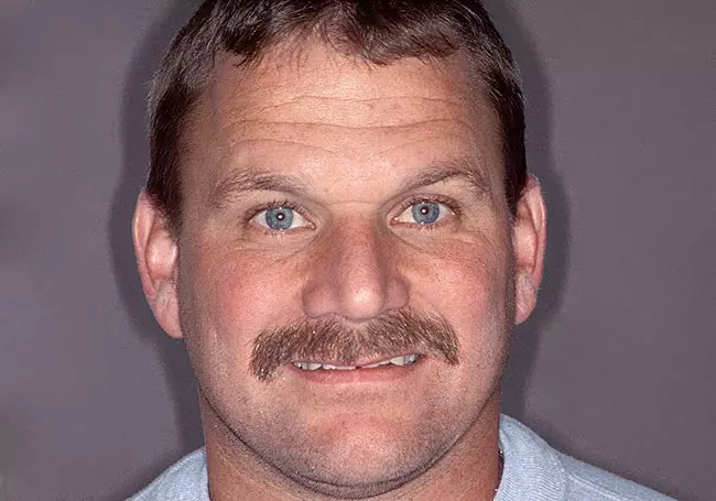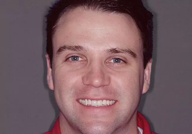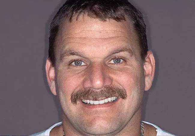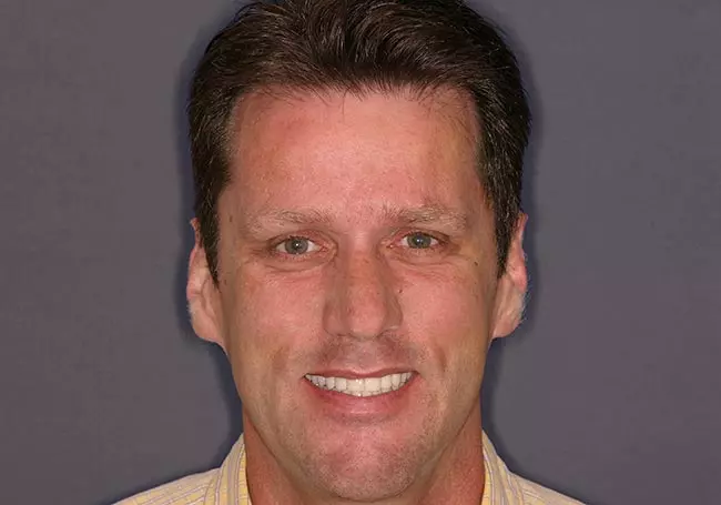 Discolored and worn teeth along with “excessive gum show” were the problems affecting this smile. A Smile Design and ten Porcelain Crowns along with a Gum Lift solved these problems and revitalized his smile.