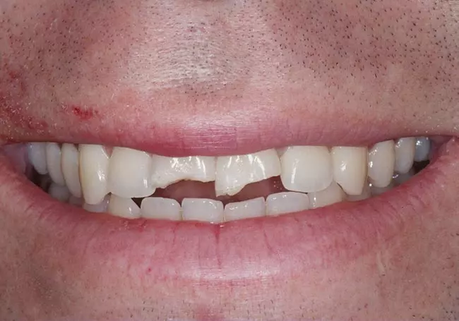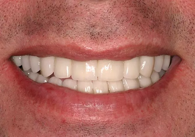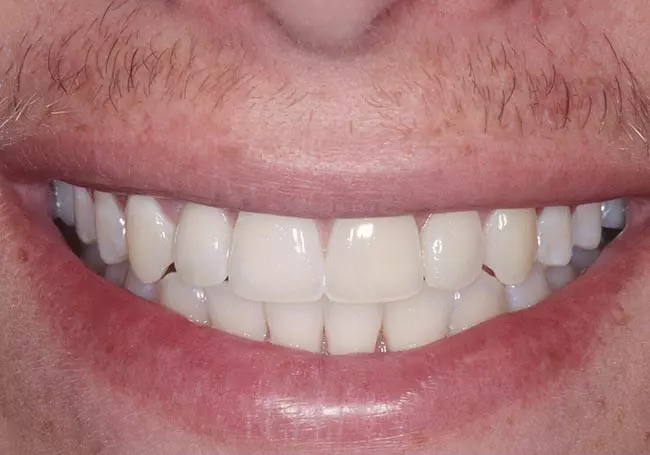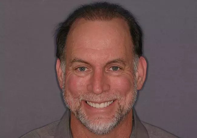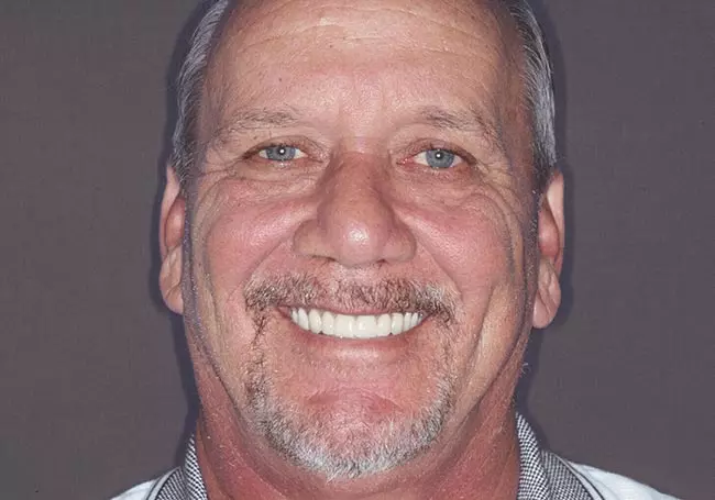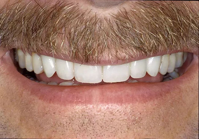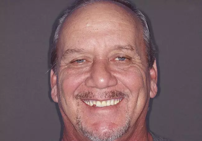 Dark, uneven, and worn teeth along with an unnatural looking crown were the problems affecting this smile. Twenty-three Porcelain Crowns transformed his smile into a “younger looking” and “attractive smile”.