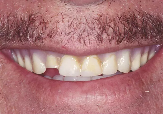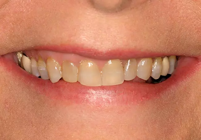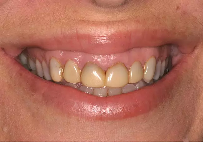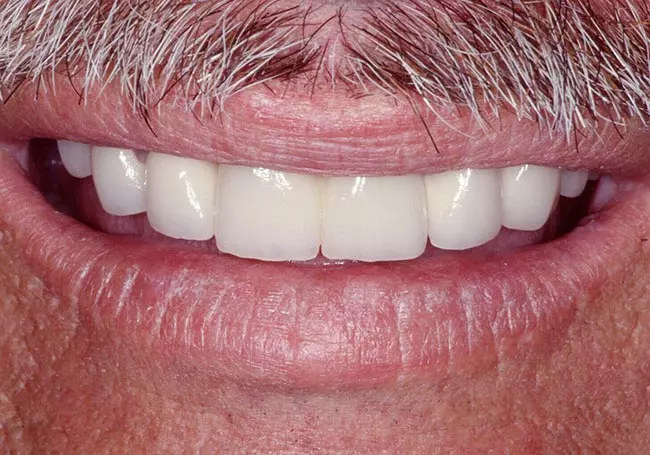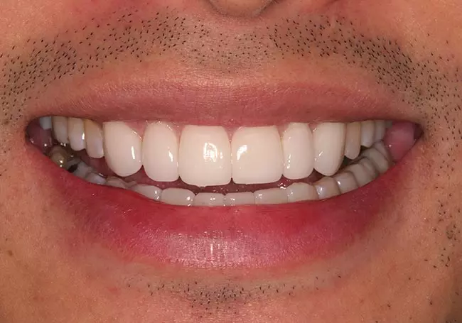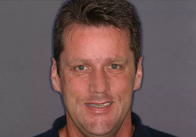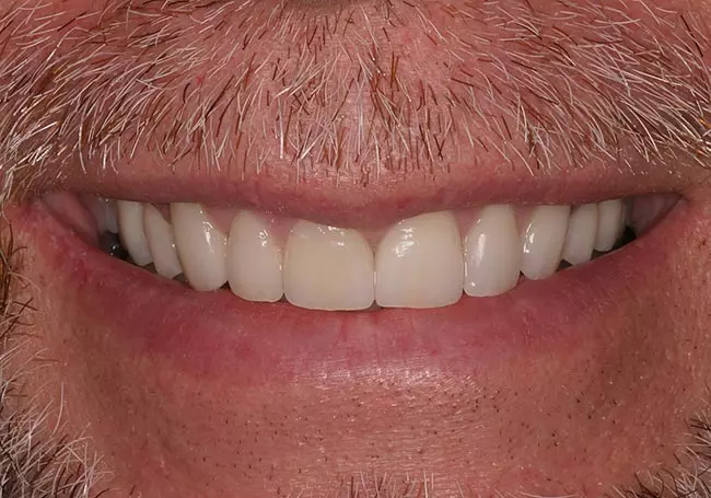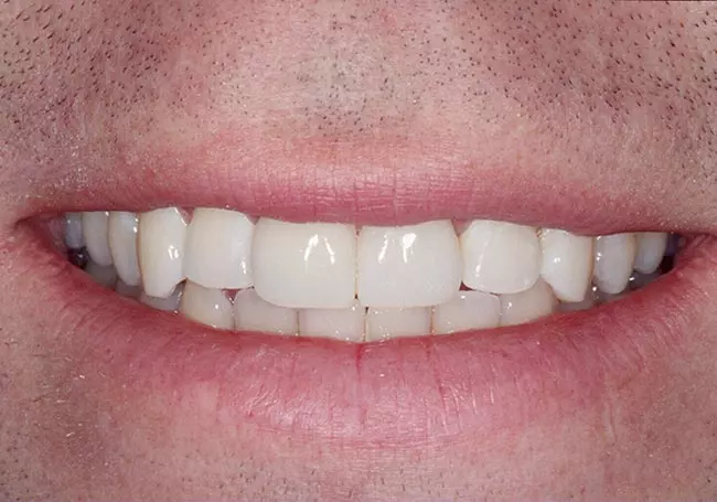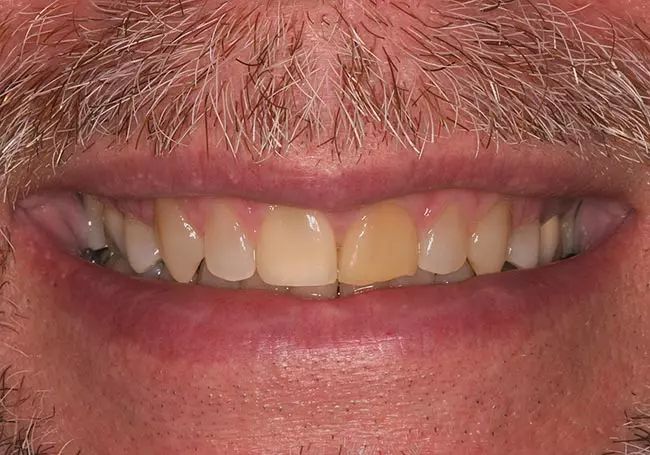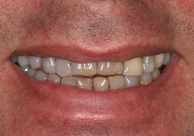 Worn, uneven teeth along with a “gap” and a reverse smileline made it difficult for him to smile. A Smile Design and six Porcelain Crowns changed not only his smile but his self-image.