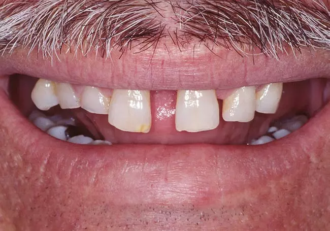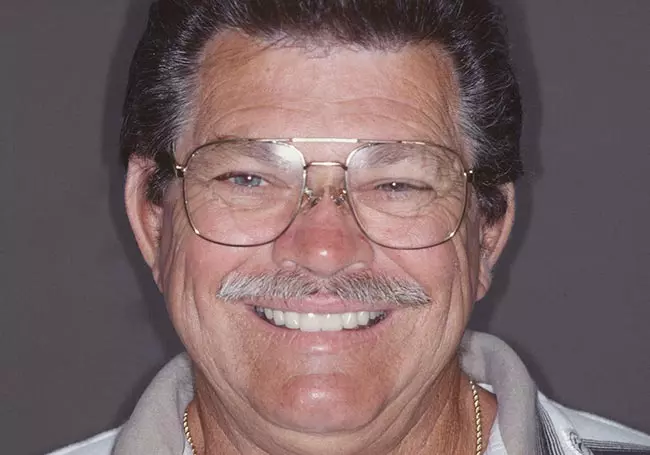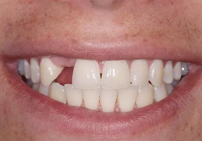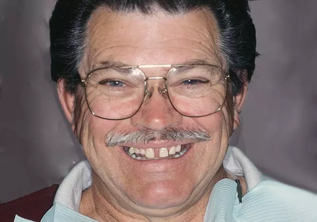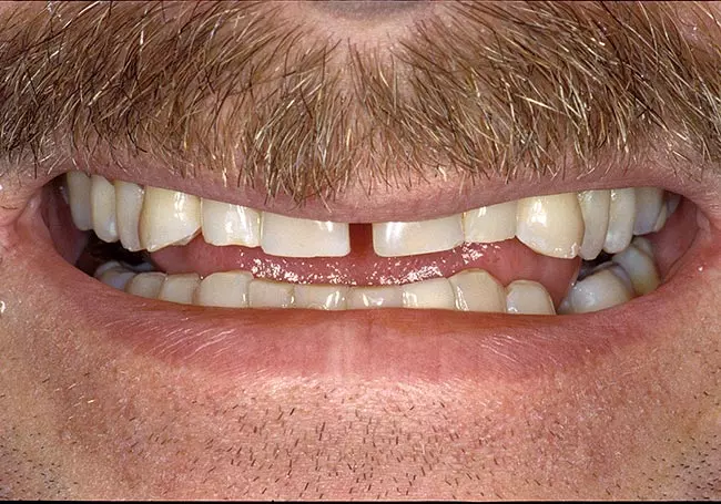 A large “gap” along with missing and uneven teeth caused many problems. Six Porcelain Fused to Metal Crowns along with a Precision Attachment Partial Denture enhanced his entire image.