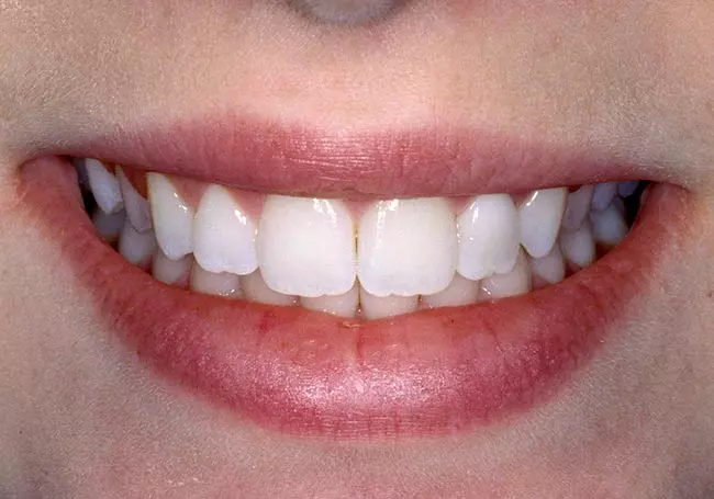 A misaligned bite and night-time grinding caused excessive wear on her front teeth and a flat smileline. “Transitional” Direct “Chairside” Bonding was used to redesign her smile following correction of her bite.