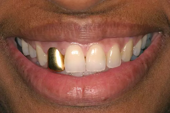 She became unhappy with the gold crown on her front tooth and her yellowed natural teeth. Zoom Whitening, Cosmetic Gum Recontouring, and a single Porcelain Crown restored her smile back to its original beauty and gave her a new look.