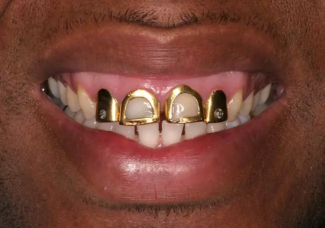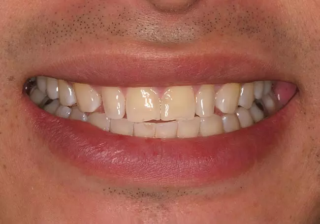 Before: He was unhappy with the spaces between his lower teeth and grew to regret the gold crowns he had placed on his upper teeth at a younger age. He was ready for a change! A Smile Design including eight Porcelain Full Veneers on his upper teeth along with Chairside Bonding on his lower teeth gave him the change he was looking for.